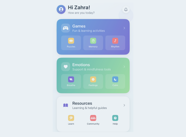 Zubi Space is our mobile app project launching soon which will promote digital well-being and emotional and learning development for adolescents and young adults with SEN and mental health needs.